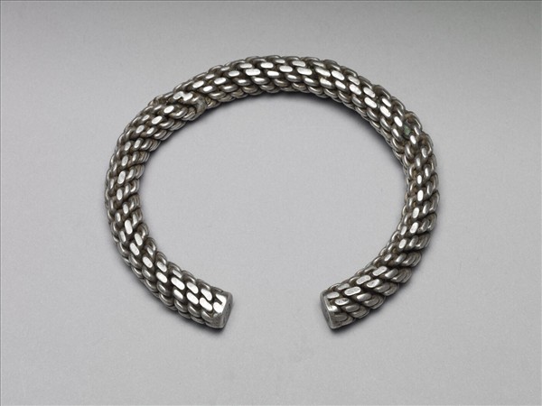 銀銅合金手鐲,全器由數條粗金屬鎖鏈旋繞成緊密相連之螺旋紋,並呈一圓環形狀,帶缺口以供手腕穿戴。兩端缺口處平整,兩端各有一長方框,文字模糊難辨。