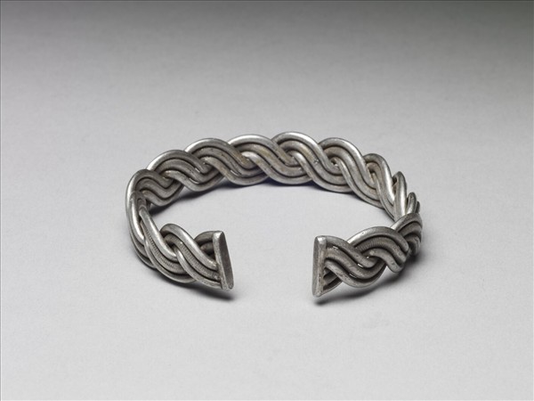 銀銅合金手鐲,全器器形扁平,由兩道粗線交叉而成,粗線由三並細排金屬條組成,兩旁金屬條光素,中間者飾橫條紋。器身帶缺口以供手腕穿戴。