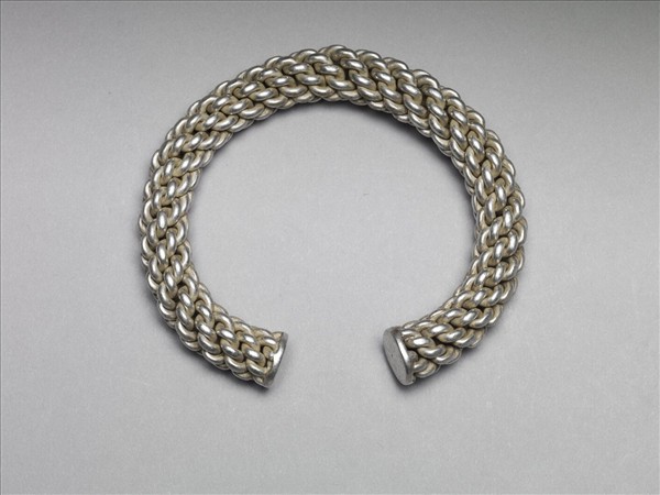 銀銅合金手鐲,全器由數條粗金屬鎖鏈旋繞成緊密相連之螺旋紋,並呈一圓環形狀,帶缺口以供手腕穿戴。兩端缺口處平整,一端帶有無法辨識之文字。