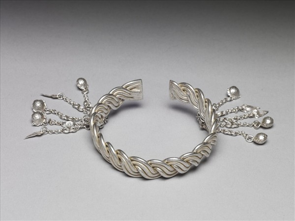 銀銅合金手鐲,全器器形扁平,由兩組粗線交叉而成,粗線由三並排細金屬條組成,兩旁金屬條光素,中間者飾橫條紋。器身帶缺口以供手腕穿戴。缺口旁各綴五條銀鍊,銀鍊中各接一菊花形銀片,底端分別接三鈴鐺與兩菱形墜角,鈴鐺表面敲出凹凸紋路。