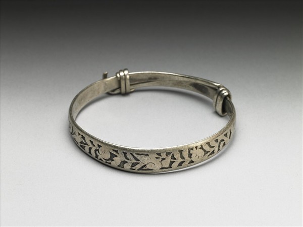 銀銅合金手鐲,全器由一扁平金屬條彎繞成一圓環,兩端漸細,末端各由一金屬條將其纏繞固定,可調整手鐲大小並兼具裝飾功能。手鐲正面飾滿花果與鳥禽,背面光素無紋。