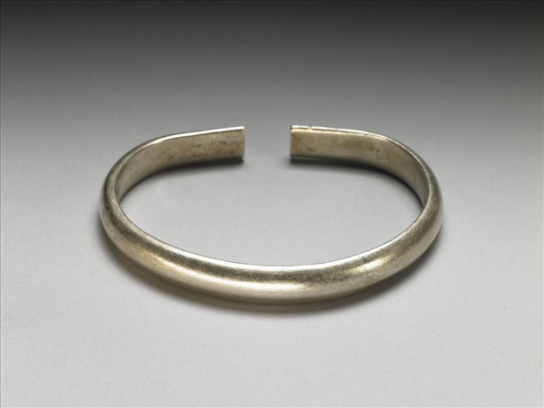 銀銅合金手鐲,全器由一金屬條彎繞成一圓環,全器粗細均勻,帶缺口以供手腕穿戴,兩端缺口處平整。手鐲全器光素無紋。