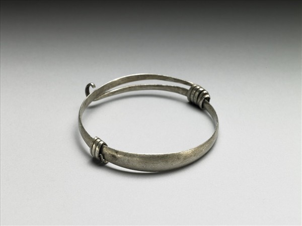 銀銅合金手鐲,全器由一扁平金屬條彎繞成一圓環,兩端漸細,一末端彎曲成鉤,一端成迴旋纏繞之金屬圈。鐲身彼端亦有一對稱金屬圈。手鐲光素無紋。