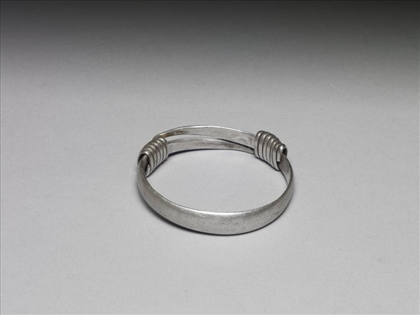 銀銅合金手鐲,全器由一扁平金屬條彎繞成一圓環,兩端漸細,末端皆成為迴旋纏繞之金屬圈,可調整手鐲大小並兼具裝飾功能。手鐲光素無紋。