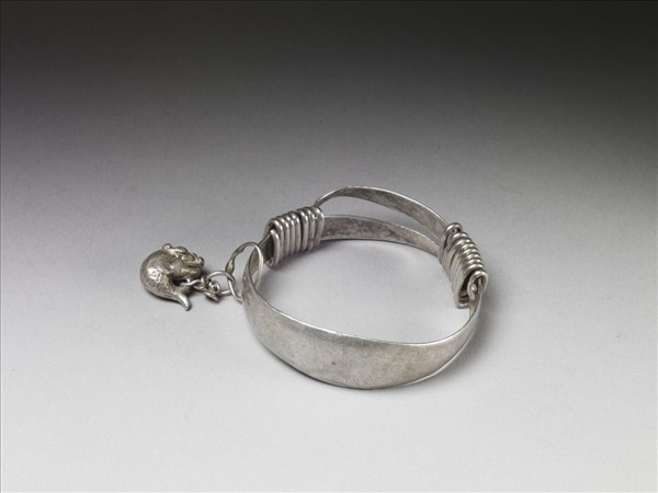 銀銅合金手鐲,全器由一扁平金屬條彎繞成一圓環,兩端漸細,末端皆以迴旋纏繞之金屬圈包覆,可調整手鐲大小並兼具裝飾功能。手鐲光素無紋,綴有一異獸形墜角,獸口微張,身軀呈肥碩魚形,鱗片清晰可見。