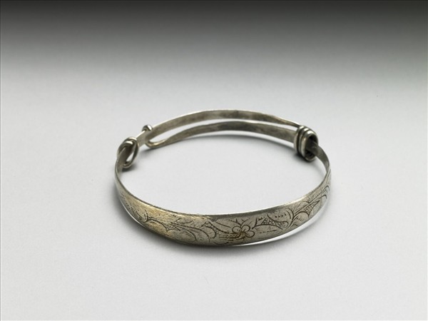銀銅合金手鐲,全器由一扁平金屬條彎繞成一圓環。兩端漸細,一端成彎鉤,另一端成迴旋纏繞之金屬圈,可調整手鐲大小並兼具裝飾功能。鐲身彼端亦有一對稱金屬圈。手鐲正面淺刻花葉紋。