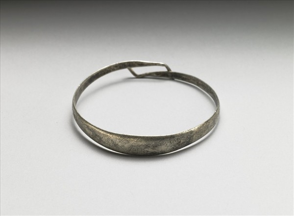 銀銅合金手鐲,全器由一扁平金屬條彎繞成一圓環,兩端漸細,末端皆成一彎鉤。手鐲光素無紋。