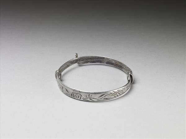 銀銅合金手鐲,全器由一扁平金屬條彎繞成一圓環。兩端漸細,一端成彎鉤;另一端成為迴旋纏繞之金屬圈,可調整手鐲大小並兼具裝飾功能,鐲身另一端亦有一對稱金屬圈。手鐲正面淺刻抽象紋飾。