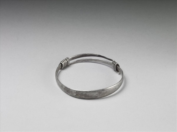 銀銅合金手鐲,全器由一扁平金屬條彎繞成一圓環,兩端漸細,兩末端皆以迴旋纏繞之金屬圈包覆,可調整手鐲大小並兼具裝飾功能。手鐲正面光素無紋。
