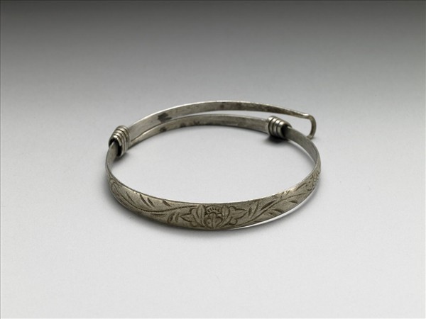 銀銅合金手鐲,全器由一扁平金屬條彎繞成一圓環。兩端漸細,一端成彎鉤,另一端成為迴旋纏繞之金屬圈,可調整手鐲大小並兼具裝飾功能。鐲身另帶有一金屬圈。手鐲正面陰刻花葉紋。