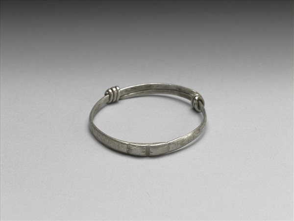 銀銅合金手鐲,全器由一扁平金屬條彎繞成一圓環。中段稍厚而兩端漸細,兩末端皆成為迴旋纏繞之金屬圈,可調整手鐲大小並兼具裝飾功能。鐲身另帶有一金屬圈。手鐲正面刻花葉紋。