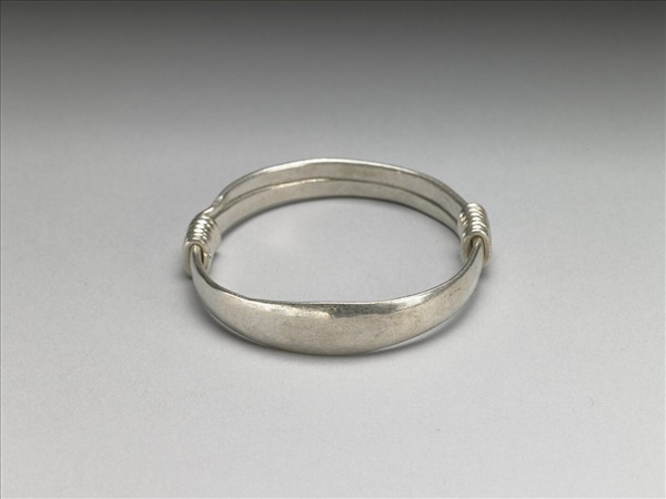 銀銅合金手鐲,全器由一扁平金屬條彎繞成一圓環。中段稍厚而兩端漸細,兩末端皆成為迴旋纏繞之金屬圈,可調整手鐲大小並兼具裝飾功能。手鐲正面光素無紋。