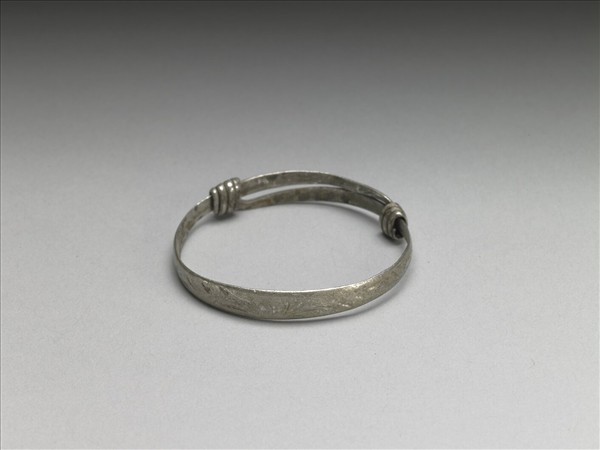 銀銅合金手鐲,全器由一扁平金屬條彎繞成一圓環,兩端漸細,兩末端皆成為迴旋纏繞之金屬圈,可調整手鐲大小並兼具裝飾功能。手鐲正面陰刻花葉紋。