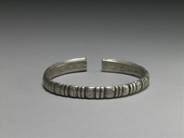 銀銅合金手鐲,全器由一粗細均勻之扁平金屬條彎繞成一圓環,帶缺口以供手腕穿戴。兩端缺口齊整。手鐲正面刻飾多組線條,各組線條間飾抽象與幾何紋飾。