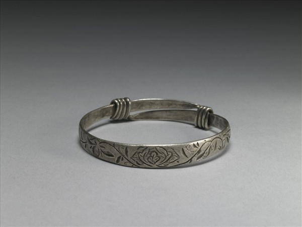 銀銅合金手鐲,全器由一扁平金屬條彎繞成一圓環,兩端漸細,兩末端皆成為迴旋纏繞之金屬圈,可調整手鐲大小並兼具裝飾功能。手鐲正面淺刻花葉紋飾,背面帶兩長方框,框內文字模糊未辨。