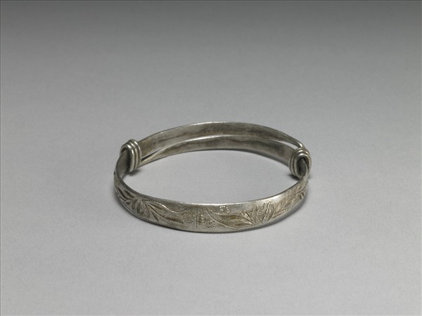 銀銅合金手鐲,全器由一扁平金屬條彎繞成一圓環,兩端漸細,兩末端皆成為迴旋纏繞之金屬圈,可調整手鐲大小並兼具裝飾功能。手鐲正面刻飾捲曲翻轉之花葉紋,風格細膩素雅。背面帶一長方框印記,文字模糊難辨。