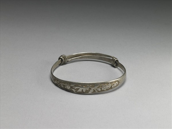 銀銅合金手鐲,全器由一扁平金屬條彎繞成一圓環,兩端漸細,兩末端皆成為迴旋纏繞之金屬圈,可調整手鐲大小並兼具裝飾功能。手鐲正面以淺粟米銀珠為地紋,上飾花葉紋。