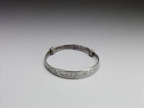 銀銅合金手鐲,全器由一扁平金屬條彎繞成一圓環。兩端漸細,兩末端皆成為迴旋纏繞之金屬圈,可調整手鐲大小並兼具裝飾功能。手鐲正面陰刻花葉紋。