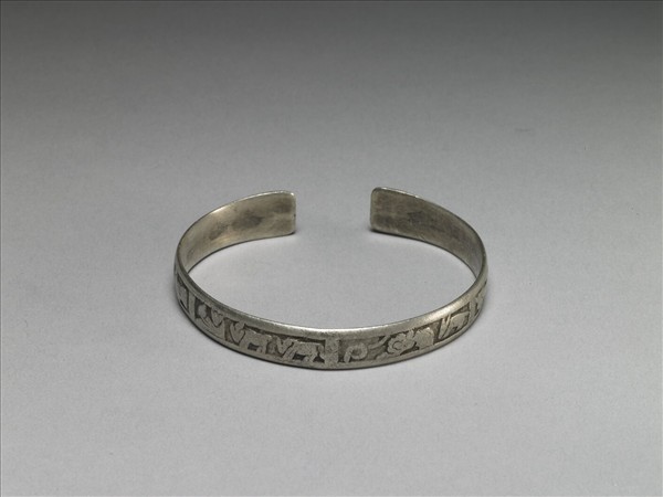 銀銅合金手鐲,全器由一粗細均勻之扁平金屬條彎繞成環狀,尾端不相銜接成缺口,兩端缺口處平整。手鐲正面隔成四區,分飾抽象動物花草圖案。