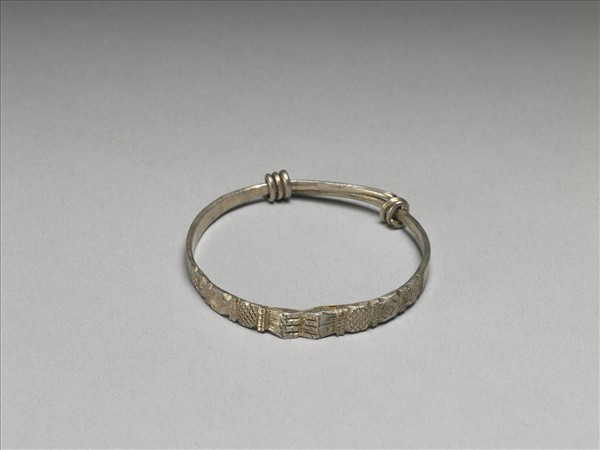 銀銅合金手鐲,整器由兩端較細的金屬片製作而成。中段部分有如雙駝峰淺凸起,上刻陰線紋。兩旁金屬面凸棱分隔壁面,兩稜間壁面以網狀紋和斜格紋為飾。金屬片拗彎為圓,兩端分別反折旋繞於器身,作為配戴時固定及調整環徑之用。