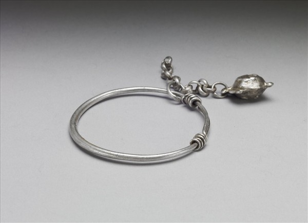 銀銅合金手鐲,整器由兩端較細的金屬條製作而成。外壁光素無紋,帶墜角。金屬條拗彎為圓,兩端分別反折旋繞於器身,作為配戴時固定及調整環徑之用。器身模刻「□□和興」四字。