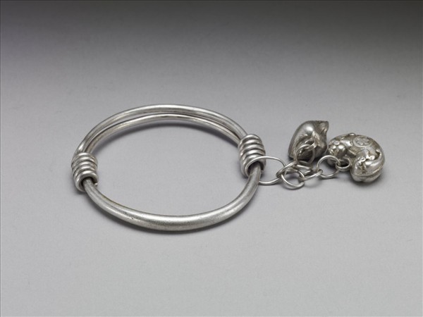 銀銅合金手鐲,整器由兩端較細的金屬條製作而成。外壁光素無紋,帶二墜角。金屬條拗彎為圓,兩端分別反折旋繞於器身,作為配戴時固定及調整環徑之用。
