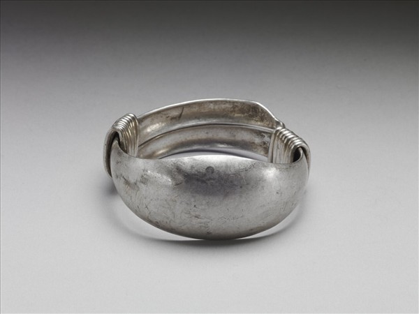 銀銅合金手鐲,整器由金屬片構成。金屬片中段面積甚大並向外弧凸,表面光素無紋。兩端急收,依賴器身上緊密螺旋纏繞的金屬條,來固定及調整環徑。