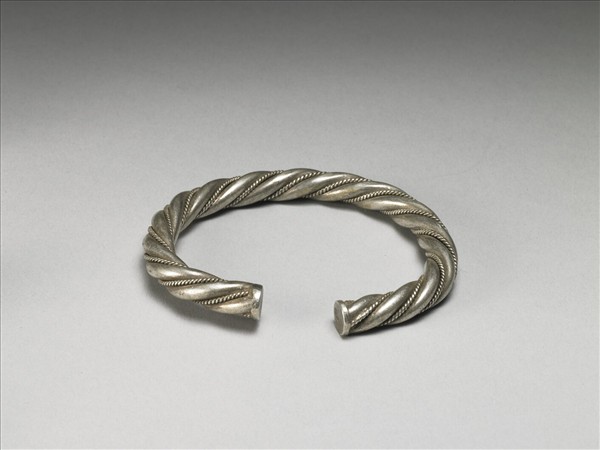銀銅合金手鐲,整器由粗金屬間以一細金屬條交錯纏繞成絞絲狀而成器。細金屬條作表面鏨為絞絲紋,粗金屬條則表面光素,金屬條拗彎為圓環形。帶缺口以供手腕穿戴。