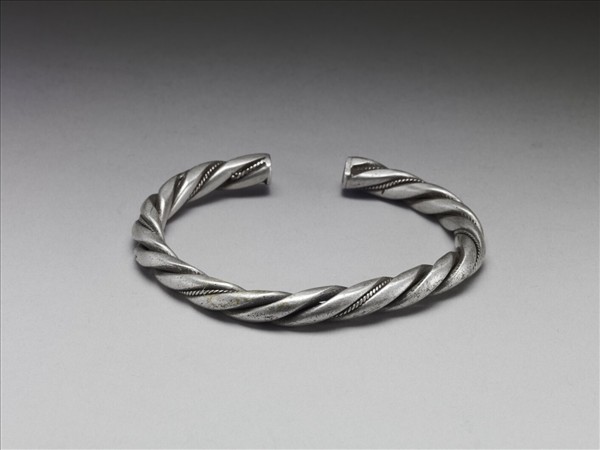 銀銅合金手鐲,整器由粗金屬間以一細金屬條交錯纏繞成絞絲狀而成器。細金屬條作表面鏨為絞絲紋,粗金屬條則表面光素。金屬條拗彎為圓環形,帶缺口以供手腕穿戴。另末端雖刻有楷字印記,但模糊難辨。
