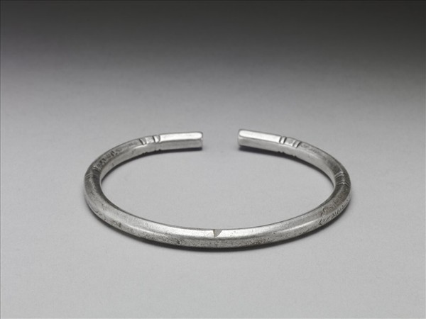 銀銅合金手鐲,整器由金屬條拗彎成環形而成器。外壁鍛敲為多面狀,上以陰刻線條、菱形及梭形紋;外壁內側有鏨刻印記,但文字難以辨認。環形器帶缺口以利穿戴。