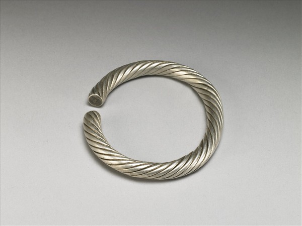 銀銅合金手鐲,整器由數條金屬片在金屬條表面緊密繞旋,並將整體拗彎成環形而成器。環形器帶缺口以利穿戴。