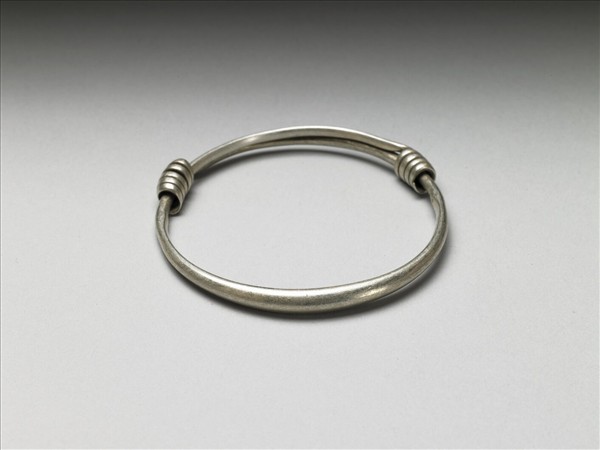 銀銅合金手鐲,整器由兩端較細的金屬條製作而成。外壁光素無紋。金屬條拗彎為圓,兩端分別反折旋繞於器身,作為配戴時固定及調整環徑之用。