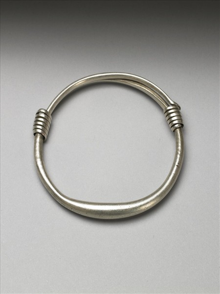 銀銅合金手鐲,整器由兩端較細的金屬條製作而成,外壁光素無紋。金屬條拗彎為圓,兩端分別反折旋繞於器身,作為配戴時固定及調整環徑之用。