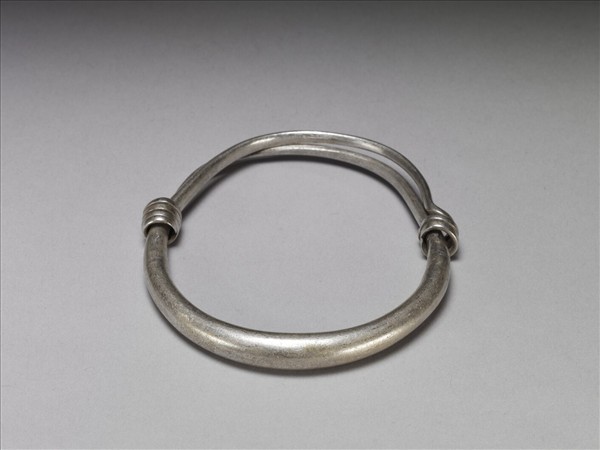 銀銅合金手鐲,整器由兩端較細的金屬條製作而成。外壁光素無紋。金屬條拗彎為圓,兩端分別反折旋繞於器身,作為配戴時固定及調整環徑之用。