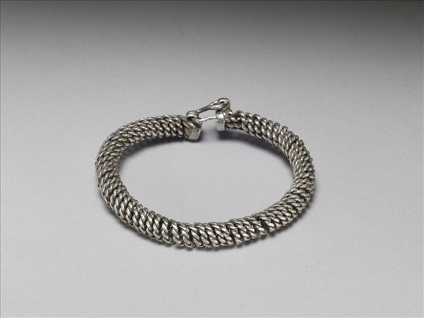 銀銅合金手鐲,整器由金屬細鍊緊密懸繞為環形而成器,兩端銲連鉤環,以為配戴時固定之用。