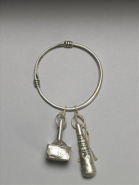 銀銅合金手鐲,整器由兩端較細的金屬條製作而成,外壁光素無紋。金屬條拗彎為圓,兩端分別反折旋繞於器身。帶二金屬飾件為墜角,一墜角如球棒,上有斜格紋、曲線紋,另一墜角呈方印形,印面「玉堂寶馬」四篆字。
