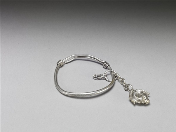 銀銅合金手鐲,整器由兩端較細的金屬條製作而成,外壁光素無紋。金屬條拗彎為圓,兩端分別反折旋繞於器身,器身有四字印記,但難以辨讀。帶金屬飾件為墜角。