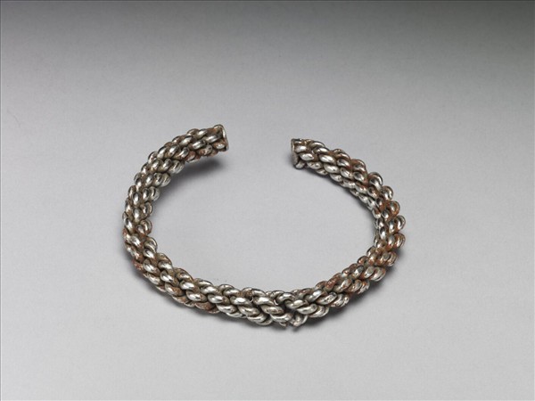 銀銅合金手鐲,整器由金屬鍊緊密懸繞為環形而成器,表面蝕銹,帶缺口以利穿戴。