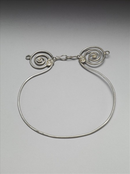 銀銅合金項圈,整器主要由一勻整的金屬條製作而成,亦即把金屬條拗彎近圓,並未收緊成圓。金屬線兩端反向向內繞旋為漩渦狀,但繞旋較鬆,最外層空隙以蝙蝠飾件並聯,金屬兩端繞旋上並有金屬鉤,可在配戴時相鉤連固定。