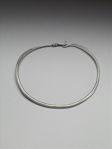 銀銅合金項圈,整器由兩端較細的金屬條製作而成,金屬條拗彎為圓,一端反折作鉤,一端回繞為鉤環,整器光素無紋。