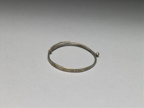 銀銅合金手鐲,整器由兩端較細的金屬條製作而成,中段部分打薄為面,上刻簡化的卷枝花卉,金屬條彎拗為環形,兩端回折為彎鉤,用以固定、調整環徑的大小。