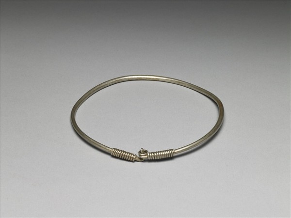 銀銅合金項圈,整器由兩端較細的金屬條製作而成。金屬條拗彎為圓,兩端分別反折作鉤、環,於配戴時相鉤固定。兩端下方各繞旋金屬片為飾,其餘部分皆光素無紋飾。