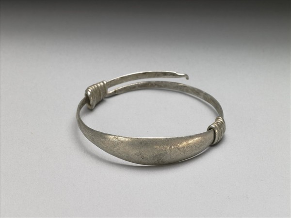 銀銅合金手鐲,整器由金屬片構成,金屬片中段面積甚大並向外弧凸,表面光素無紋。兩端急收,依賴器身上緊密螺旋纏繞的金屬條,來固定、調整環徑。一端有傷斷。