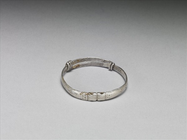 銀銅合金手鐲,整器由兩端較細的金屬片製作而成,中段部分有如雙三角形淺凸起,上刻陰線紋,兩旁僅見一些陰線紋與點狀痕。金屬片拗彎為圓,兩端分別反折旋繞於器身,作為配戴時固定、調整環徑之用。