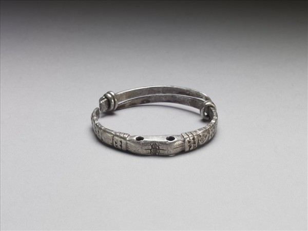 銀銅合金手鐲,整器由兩端較細的金屬片製作而成,中段部分有如雙三角形淺凸起,上刻陰線紋於圓弧紋,兩旁分數個區段裝飾,或三角紋、或圓點紋。金屬片拗彎為圓,兩端分別反折旋繞於器身,作為配戴時固定、調整環徑之用。本器有斷損。
