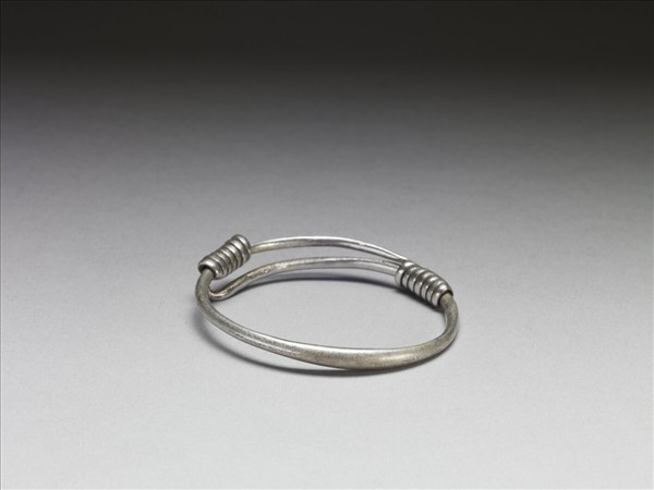 銀銅合金手鐲,整器由兩端較細的金屬條製作而成,外壁光素無紋。金屬條拗彎為圓,器身有兩段相對的緊密繞纏金屬條,可作為配戴時固定、調整環徑之用。