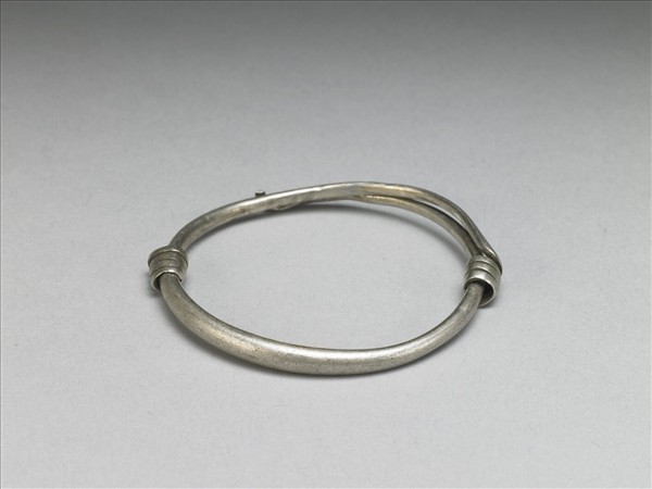 銀銅合金手鐲,整器由兩端較細的金屬條製作而成,外壁光素無紋。金屬條拗彎為圓,一端分別反折旋繞於器身,器身另又裝飾形式相同的緊密繞纏金屬片,可作為配戴時固定、調整環徑之用。