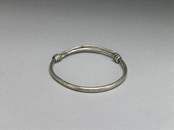 銀銅合金手鐲。整器由兩端較細的金屬條製作而成,外壁光素無紋。金屬條拗彎為圓,兩端分別反折旋繞於器身,可作為配戴時固定、調整環徑之用。