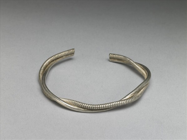 銀銅合金手鐲,整器由兩段金屬條旋繞、並拗為環形而成器。一金屬條表面鏨螺旋紋,另一金屬條光素無紋,尾端刻有款識,但難以辨認文字內容。