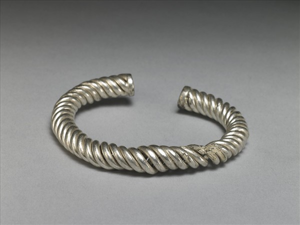 銀銅合金手鐲,有傷缺。由數條金屬條交錯絞繞並拗彎為環形而成器,帶缺口,以供手腕穿戴。另末端雖刻有楷字印記,但模糊難辨。